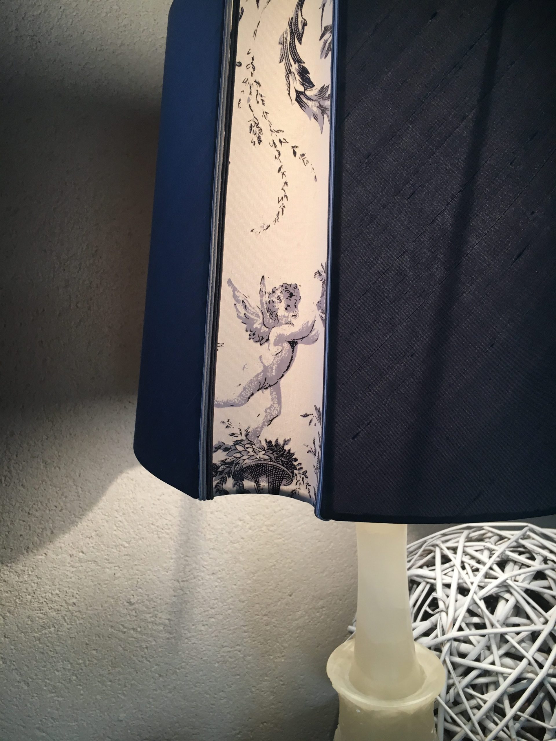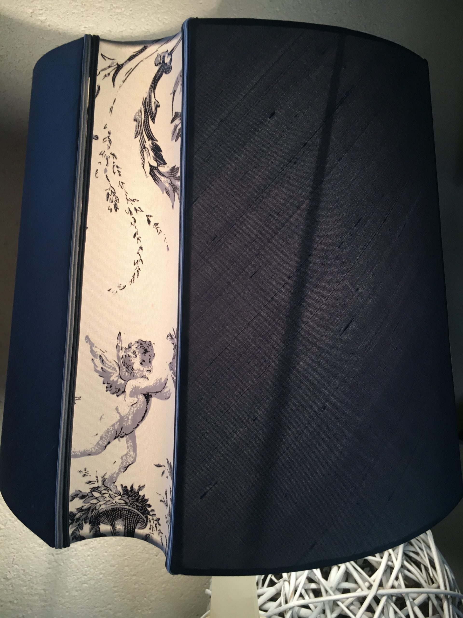 Cet abat-jour carré marine et blanc en soie sauvage est idéal pour être posé sur vos luminaires et pieds de lampe.